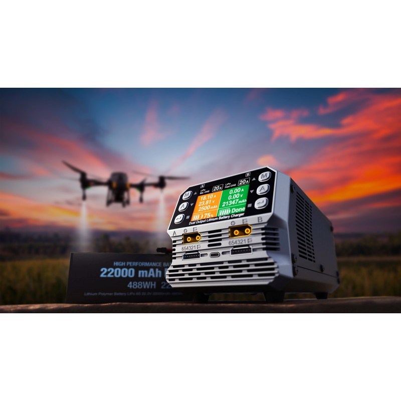 Le PC1080neo offre une solution efficace et polyvalente pour charger des batteries lithium (LiPo, LiFe, LiIon, LiHV…) en toute sécurité. Grâce à ses deux sorties indépendantes, il est possible de recharger deux packs en parallèle — pratique pour les pilotes qui disposent de plusieurs batteries.